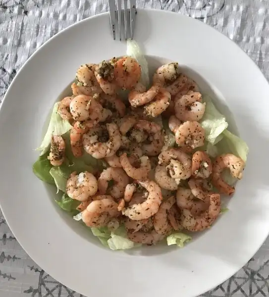 12'inçi gün öğle yemeğim diyetin biraz dışına çıktı. Evde balık kalmamış; 200 gram karidesi fırın torbasında 15 dakıka pişirdim. Akşamın öğünü olan maruldan da azıcık alarak bu öğleni böyle kapadım.