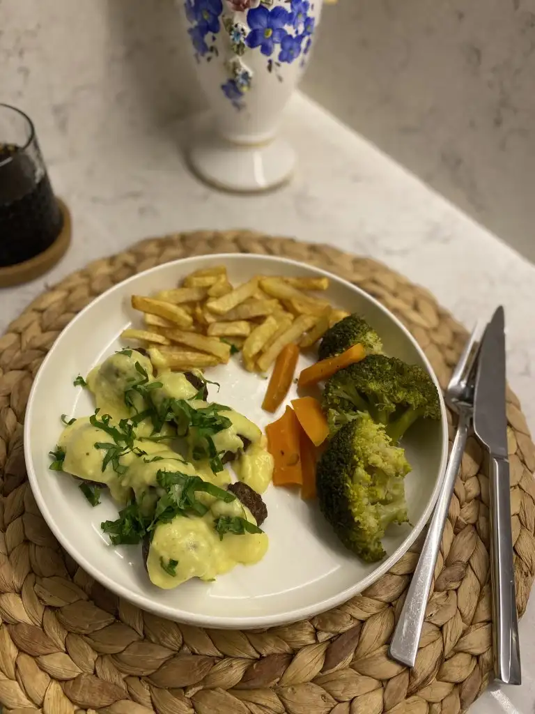 Öncelikle köfte için malzemelerin hepsini karıştırıp yoğuralım ve güzelce ceviz büyüklüğünde toplar elde edelim. Daha sonra buzdolabına 30 dakika dinlendirelim. Dinlendirdiğiniz köfteleri fırında ya da tavada ya da Air Fry’da kızartalım. Sos için ayrı bir kapta tereyagini eritip iyice kopuk olana kadar üstüne iki yemek kaşığı unu ekleyelim ununu kokusu çıkana kadar kavuralım. kokusu çıkan unun üstüne iki bardak tavuk suyunu ekleyelim varsa et suyu da olur. Ben soya sosu koymadım ama soya sosu varsa orijinalinde soya sosu koyuluyor onun yerine karabiber ve hardal ekleyip karıştırdım. Köfteler de kızardıktan sonra sosu üstüne döktüm ve yemeğimi servise hazır.