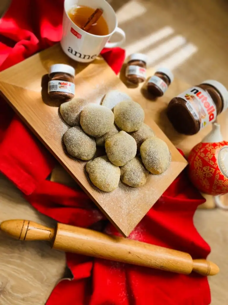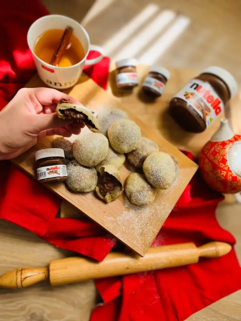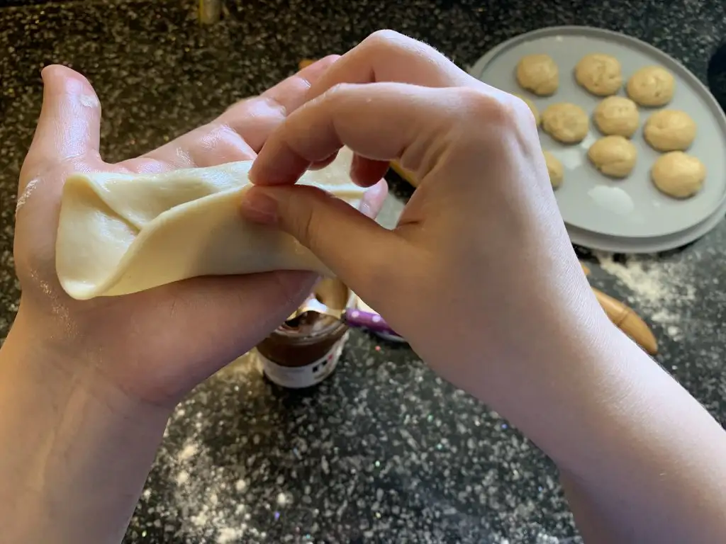 Daha sonra hamur hazır olunca bezeler halimde koparıp hazırlıyoruz. Merdane yardımıyla incecik olacak şekilde açıyoruz. İçerisine 1 tatlı kaşığı nutella koyup hamuru kapatıyoruz. Kapattıktan sonra altta kalan fazlalık hamuru koparıyoruz. O kısım altta kalacak şekilde fırın tepsimize yerleştiriyoruz. Tepsimizi fırına koyarken sıcaklığı 220 dereceye düşürüyoruz. 5-6 dk pişiriyoruz daha fazla pişirirsek içerideki çikolatası katı hal alır. O yüzden ideal süre 5-6 dkdır.