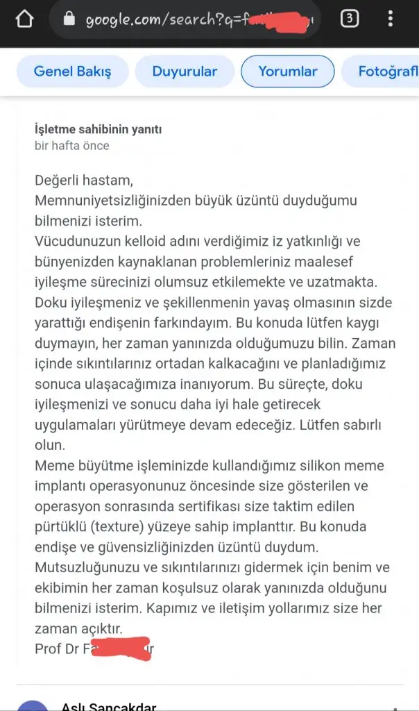 Son kez kontrole gittim ve mahkemeye verecegimi ihtar ettiğim için beni bu seansta 'para istemekle' suçladılar ve ne göğsümde ne de burnumda bir sorun olmadığını, gayet olağan olduğunu söylediler. Ben neden mememde kapsül riski az olan polytech txt serisi kullanmadıklarını sorduğumda bana göğsümde kullandığı implantin polytech txt serisi olduğunu söyledi. Ama bana verdikleri implant pasaportunda polytecth mesmo yazıyor. Yani bana taktığı implant ile verdikleri belgenin aynı olmadığını kendisi söyledi! Bunun üzerinde implant pasaportunu istedim, vermediler. Daha sonra mesajla yine istedim görmezden duymazdan geldi. Hem mağdur edilip çözümsüz bırakılıp hem bunun maddi manevi giderilmesini talep ettiğim icin 'para istemekle' manipule edildim. Tüm bunlar üzerinde kendisiyle tartıştık. Beni manipule ettiğini, ortada ihtilafli bir durum olmadığını, apacik bir sorun olduğunu, evhamli olsaydım bir sene boyunca sakince beklemeyeceğimi, botokslarimi kendisine yaptırmayacagimi, bana takılan implantin başka olduğunu kendi ağzıyla itiraf ettiğini söyledim son randevuda. Ortada şekil veya sonucu beğenmeme gibi bir durum değil, apaçık memede form bozukluğu, protezin topaklanması, kocaman dikiş izleri var. Ve burun kanatlarına müdahale etmedigini itiraf ettiği ve ucunda kemik çıkıntısı olduğu halde beni ayrıntılara çok dikkat etmekle eleştirdi.