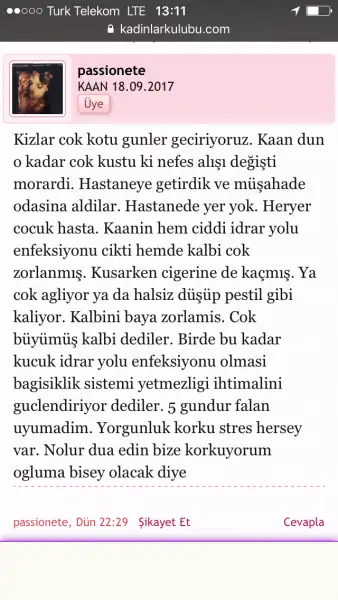 Veson Veson passionete passionete e sen daha kolay ulaşırsın belki. Hani demiş ya idrar yolu enfeksiyonu çok fazlaymış diye. Benim yeğenimde de aynı sorun vardı, bebeği kaybedebilirdiniz demişlerdi, sonunda nötrofil değeri düşük olduğu için bebeğin enfeksiyonu yenemediği ortaya çıktı. Nötropeni deniyor bu duruma. Teşhis koyması zor. Bizim 1 ayımızı almıştı teşhis konması. Bir söyle, belki bir faydası dokunur. Zaman Kaan bebeğimiz için çok önemli olabilir.