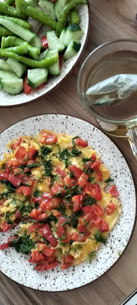 Kapya biberli ve dereotlu omlet salata ve yeşilçay 11 gibi yaptım kahvaltımı dayanamayıp sabah tartıldım ve sok oldum 1.200 Gr gitmişti 🥳
