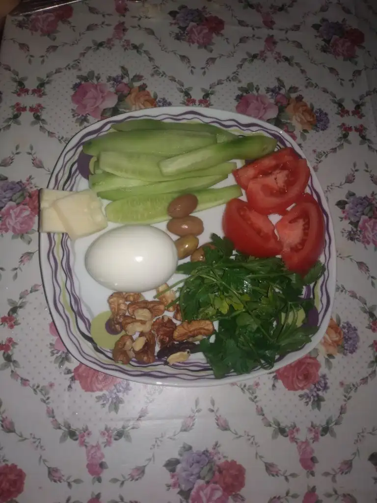 yumurta,5 zeytin ,az peynir,2 kuru kayisı,domates salatalik