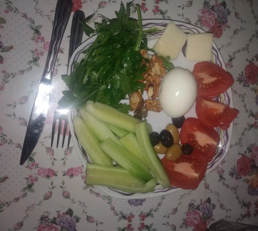 1 haşlanmış yumurta salatalık maydanoz domates 4 zeytin 2 ceviz 2 kupa çay