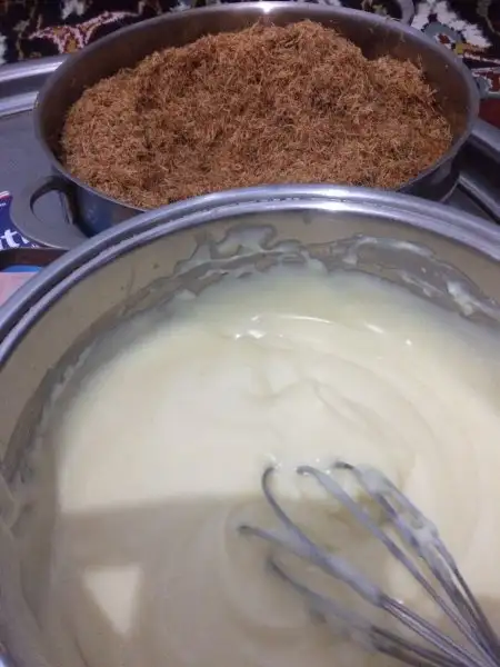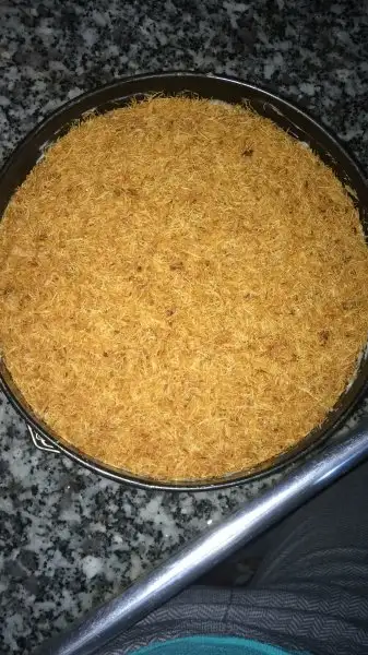 İki paket hazır pişirilmiş ve ufalanmış kadayıfı geniş bir tencereye alıp üstüne margarin ve 6yemek kaşıgı şekeri koyup kavuruyoruz ,şeker eridikten sonra, kadayıf iyice kızardıktan sonra ocaktan alıp soğumaya bırakıyoruz.