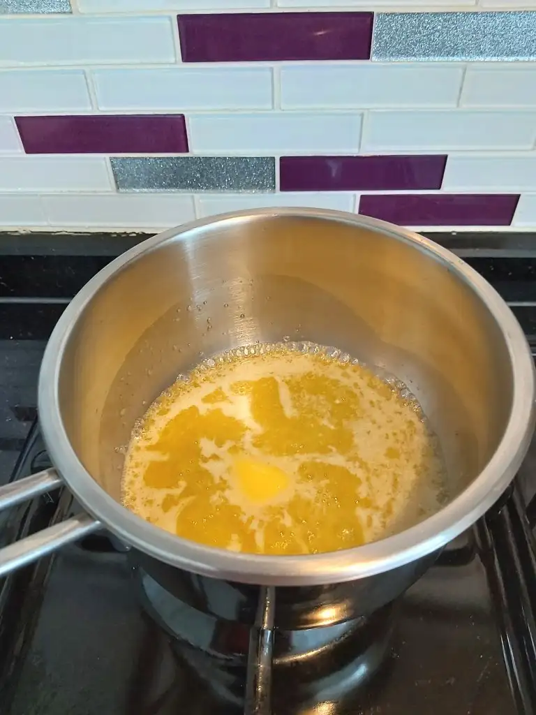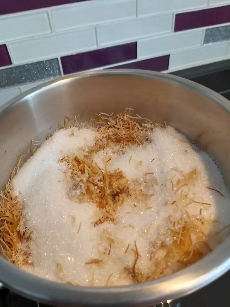 Kadayıf ve 6 kaşık toz şekeri ekleyip kavuruyoz, sonra baska bir kaba alıyoruz. Kavurduğumuz kapta kalırsa kararır.
