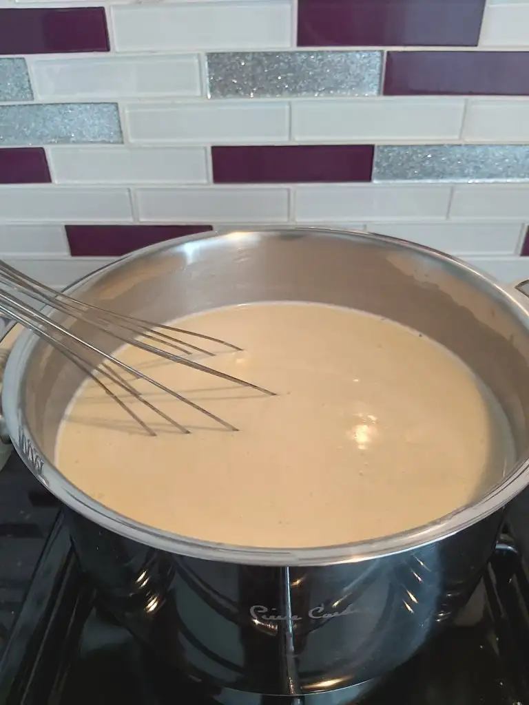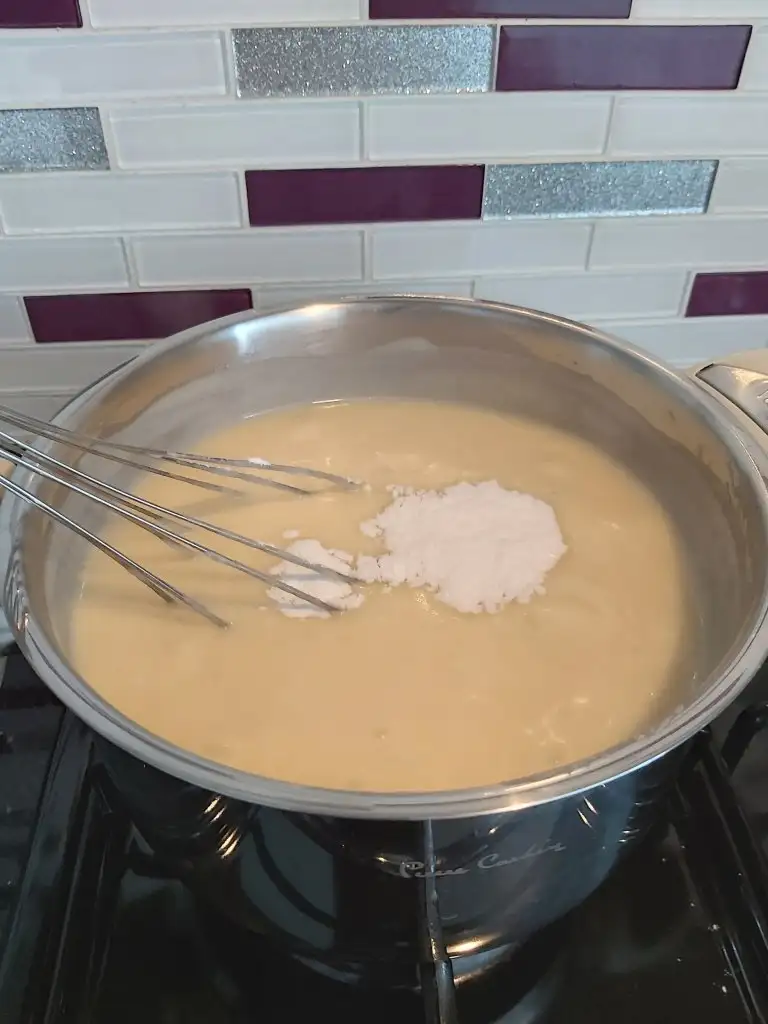 muhallebimiz için süt 3 fincan şeker, 3 fincan un, yumurtayı tencere alıp koyulaşıncaya kadar karıştırıyoruz.