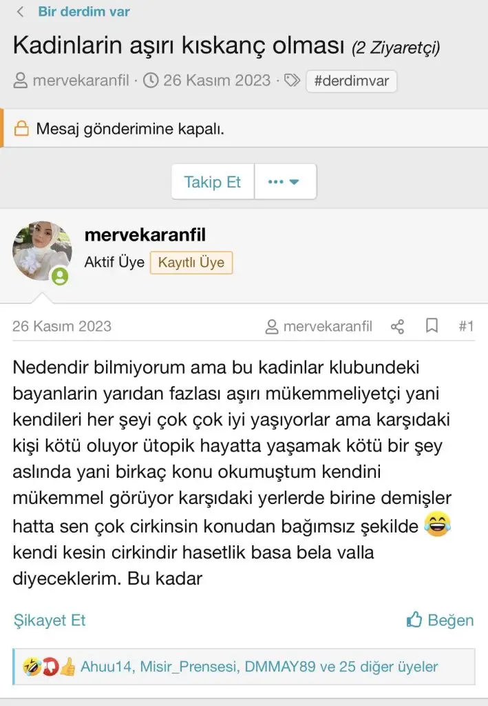 Ya ben anlamadım başka konuda güzel kadınsınız bence profilinizi kaldırın vs . dedim nezaketli olmak istedim eski konularını vs. bilmiyordum ama bir yandan da konuşulmak istiyor bence konu sahibi.Yoksa neden kendini koyupta böyle eleştirilmek ister gibi konular açar ki güzellik zaten göreceli ben beğenirim başkası beğenmez.Ama kıskanılmayacak gibi değil ki? Güzelliğinin yanına Venezuela güzeli bile yaklaşamaz. O gözler, o fındık burun, o kaşlar… Muhteşem. Asker kocayı da kapmış, sen bulabildin mi asker koca? Yani konu sahibi kıskanılmasın da ben mi kıskanılayım?