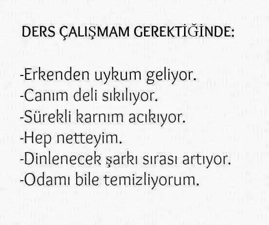 öyle valla kuzu :1::1::1: bendede öyle ya son güne bırakmışsın zaten bari son gün çalışta geç dersi diyorum sınav yarın daha çok var çalışırım akşam oluyor sabah 4 te kalkar sınava kadar çalışırım kalkyorum saati 5 kurup yatıyorum 5 te kalkıyorum 6 7 derken arabada ve sınavdayken ben :27::27::27: