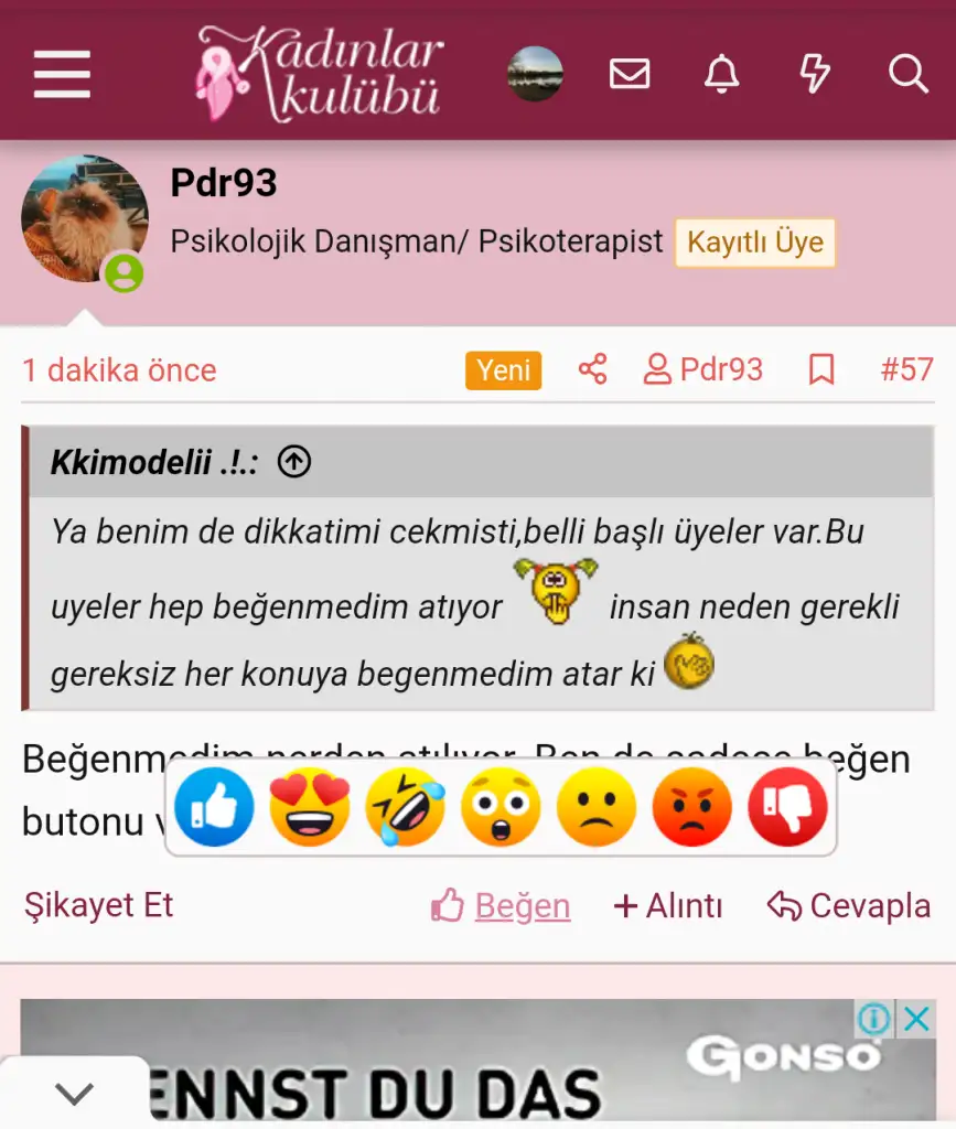 Kimse ile dalga geçmedim ,haddim cidden değil özümde de buyum . Ancak örnek veriyorum ,kişi konu ısrarla açıp diyor " a kişisi işte benimle sadece sexting olarak takılıyor ve bu ayni iş yerinde birkaç kişi ile devam etmiş ediyor ama son görüştüğü adama aşık olmuş,aradan 2 gün geçti tekrar açtı başka şekilde şimdi görücü usulü biriyle görüşecegim ,ne yapmalıyım ?" Yani inanın dalga geçmedim ama defaten de yazdım o kişiye yapma canım ,etme canım vs ... Yani bu elestiri de mi kötüye alınıyor ? Yani herkes dalga geçmiyor . Ben buraya örnek veriyorum kendi derdim ile girdim 2020 de bebek sahibi olmak için caresizligime bir nebze aynı durumları yaşayan muzdarip olanlardan bir umut , ışık görmek için ve konular da çok açtım kimse benimle dalga geçmedi . Çünkü yönelttigim şeyler dalga geçilecek şeyler değildi. Ama ben insanlara malzeme verirsem dalgaya da müsait olur durum.Cevap vermemekte bir çözüm değil midir peki?
