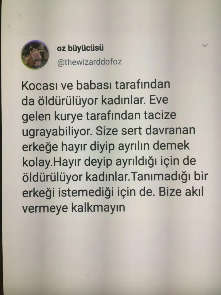 Sosyal medyada "Efendi" erkeklerimiz tavsiye veriyorlar. Bu tiplerle ilişki yaşar/evlenirseniz öldürülürsünüz konulu vaazlar veriyorlar. Erkeklerin çoğu da bu yorumları beğeniyor.