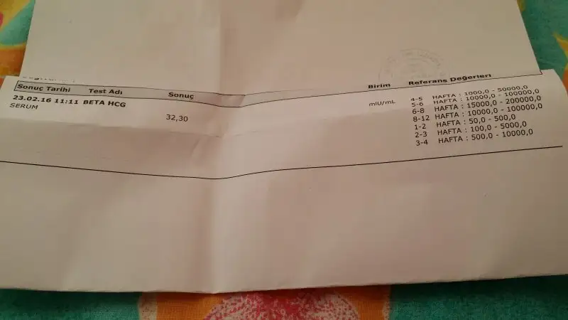 Bugun kan testi yaptim degerim 32.3 cikti. 1 haftayi yeni gecmis dediler, deger bana cok az geldi, sizce nasil? Buarada adetim 2 gun gecikti, tecrubeli arkadaslardan yorum bekliyorum. Insallah saglikla cocuklarimizi kucagimiza aliriz. Tahlil sonucumun fotosunu da atiyorum yorumlarinizi bekliyorum.