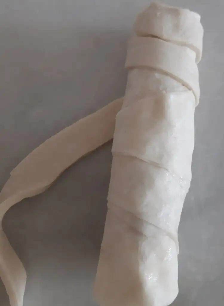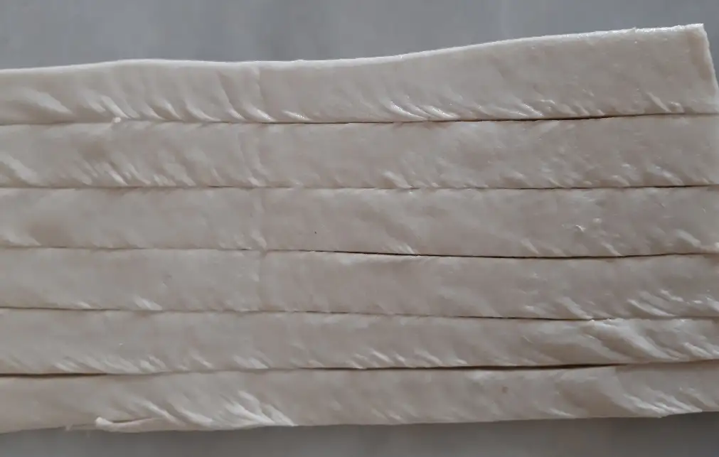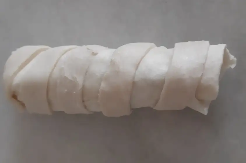 Milföy hamurunu oklava yada merdaneyle uzunlamasına birazcık açıyoruz ve ince şeritler kesiyoruz