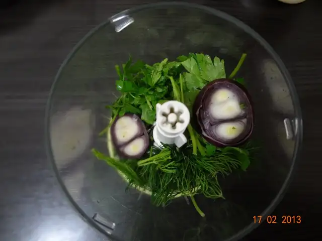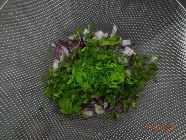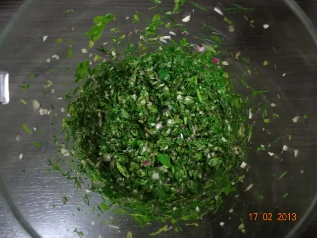 Maydanoz, dereotu ve soğanın çeyreği rondoda doğranır, bir harç oluşturulur.
