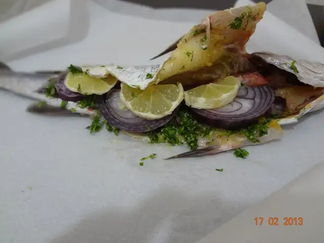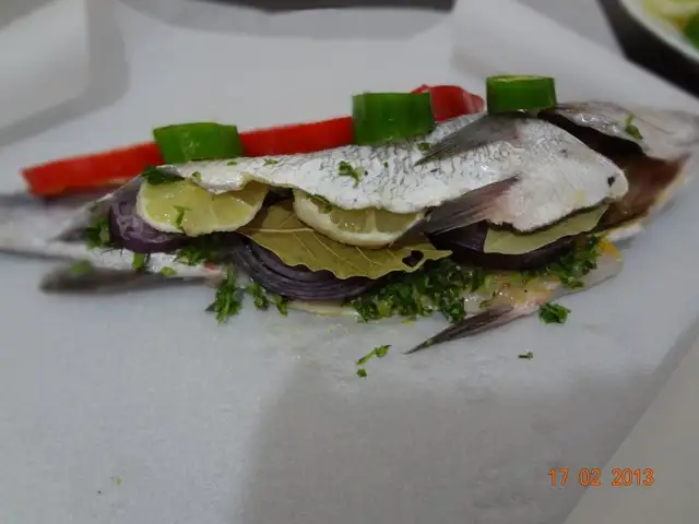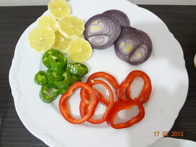Balığın iç kısmı kapatılarak üzerine kırmızı ve yeşil soğan halkaları dizilir.