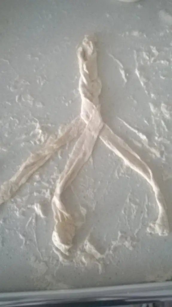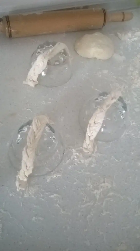 sepetimizin kolu içinde üç hamur şeridinden örgü örüyoruz.