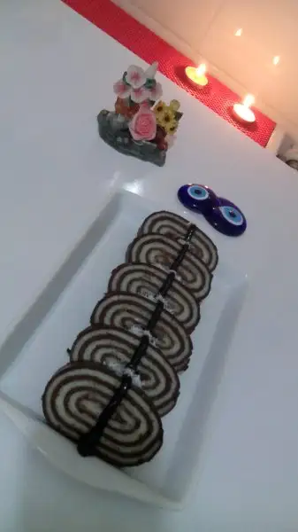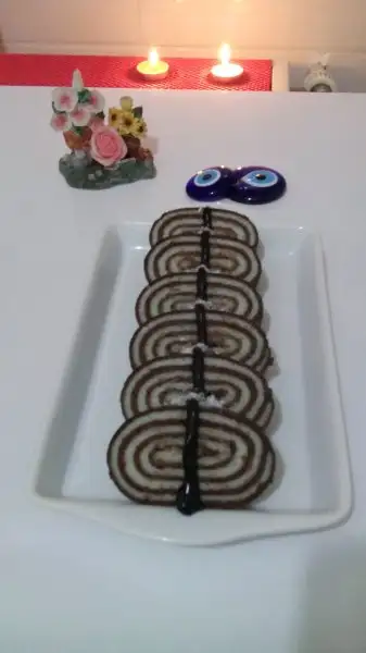 Dolaptan çıkarılan bisküvili rulo pasta arzu edildiği şekilde süslenir.