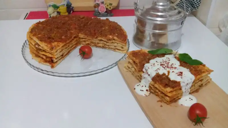 - Lavaş ve sos bitene kadar bu işlemi uygulayıp en üstüne sarımsak eklediğiniz yoğurdu döküp servis yapın.