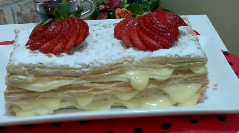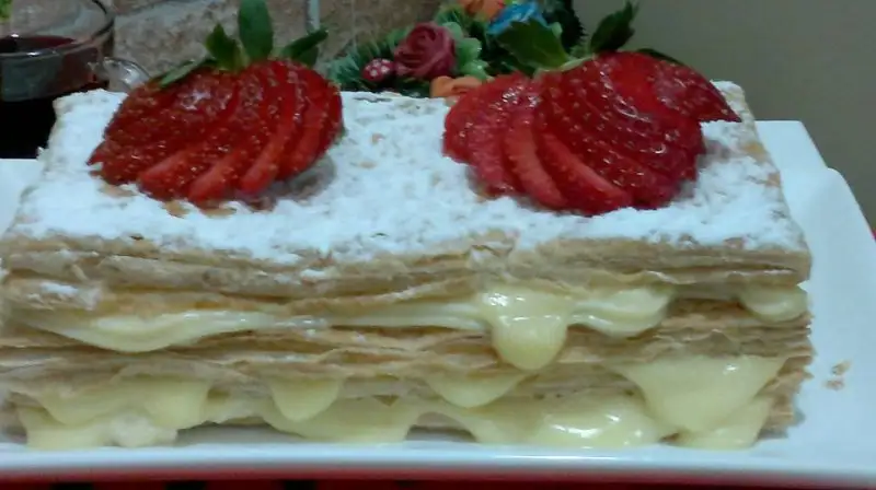 - Arzuya göre en üst katlarına ince bir kat krema sürdüğünüz milföy pastaları, pudra şekeri ve çilekle süsledikten sonra soğuk ya da ılık olarak sevdiklerinizle paylaşın.AFİYET ŞİFA OLSUN