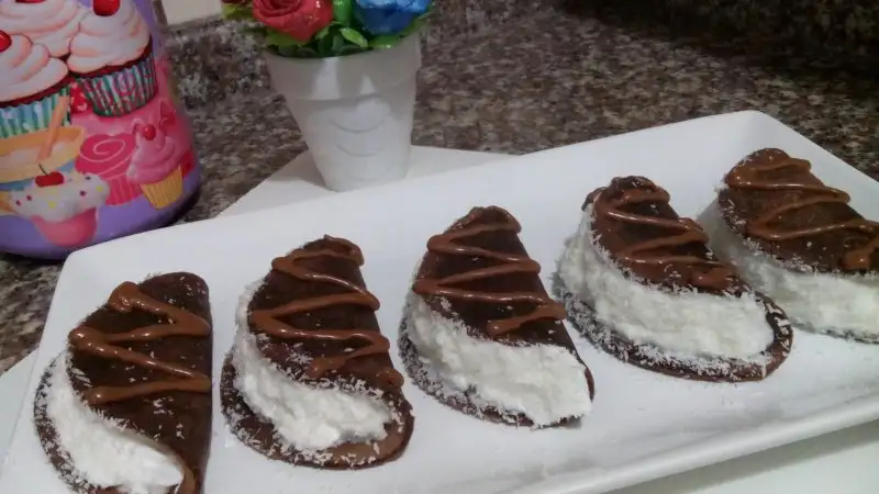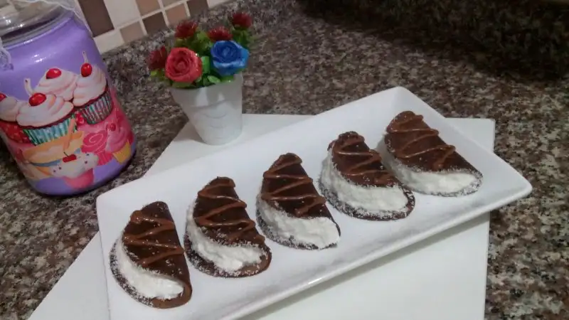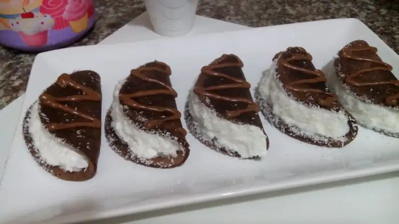 Bütün malzemeler birleştirilir kek hamuru hazırlar gibi hazırlanır. Tava ısıtılır.Yarım fincan türk kahvesi ile tavaya konulur. Sadece bir yüzü pişirilir. üzeri göz göz olunca alın fazla pişirmemeye gayret edin. Zaten piştiğini anlıyorsunuz. Pişen tabağa alınır. Tabakta bir poşetin içerisine konulur kurumasın diye. Soğuyunca hazırlanan krem şanti içine konulur ikiye katlanır. Dilerseniz şantinin içine fındık ceviz kırığı koyabilirsiniz. Not: kesinlikle sıcakken içini koymayın o zaman krem şanti yumuşuyor ve kapanmıyor. İç malzemesini soğuyunca koyun. AFİYET ŞİFA OLSUN