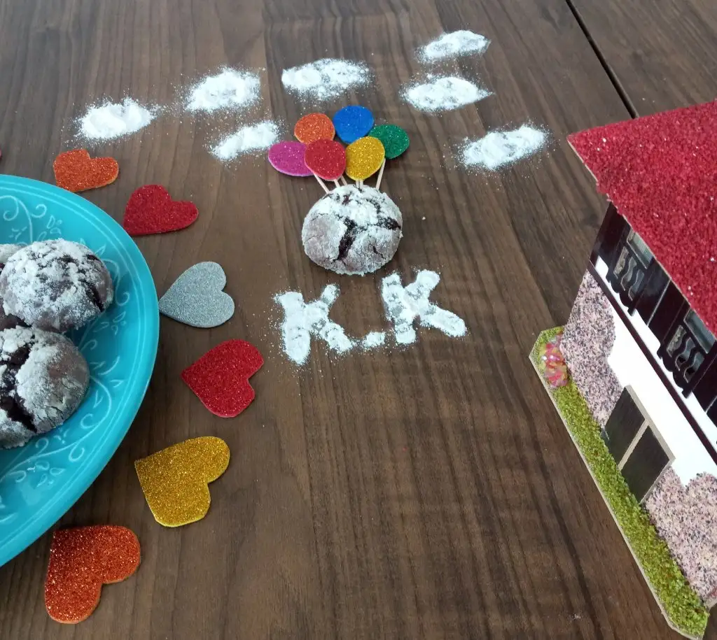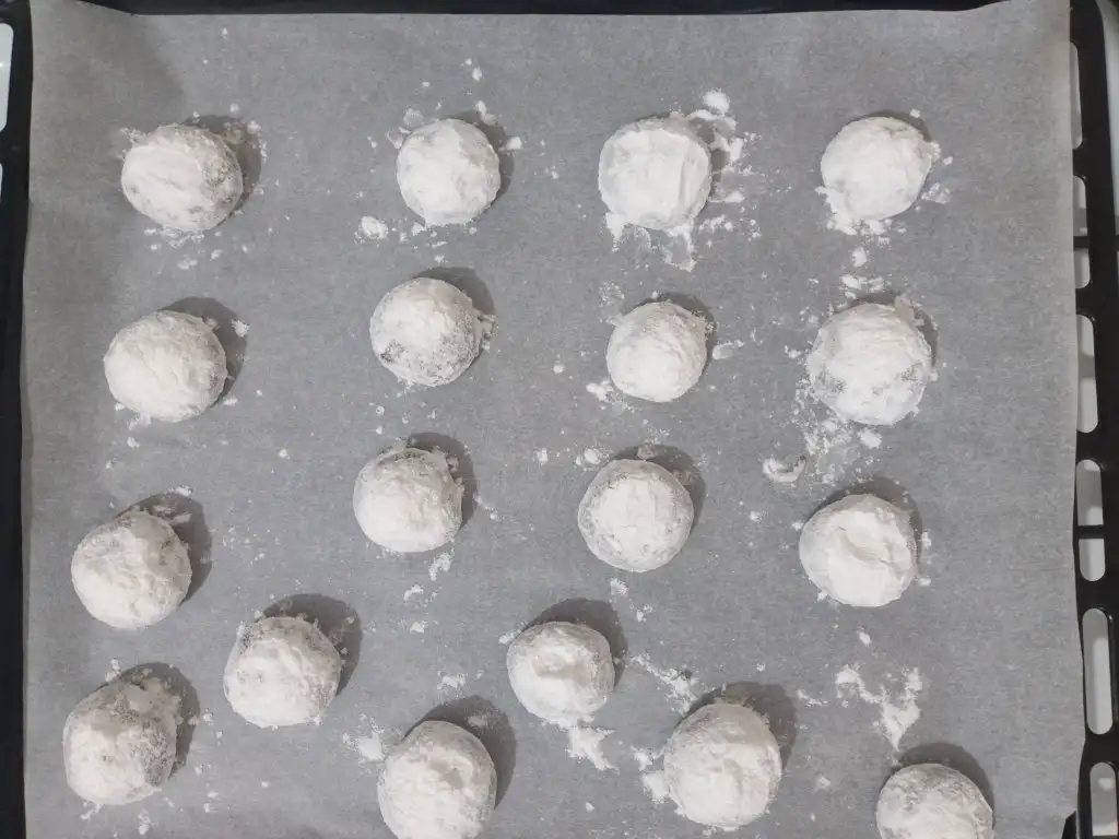 Dinlenen hamuru çıkarıp ceviz büyüklüğünde yuvarladıktan sonra pudra şekerine buluyoruz.