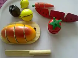 Wooden Toys marka ahşap meyve sebze kesme .Minik tahtası,bıçağı ve 7 adet birbirine cırtlarla bağlı parçalardan oluşan yiyecekler 10 TL