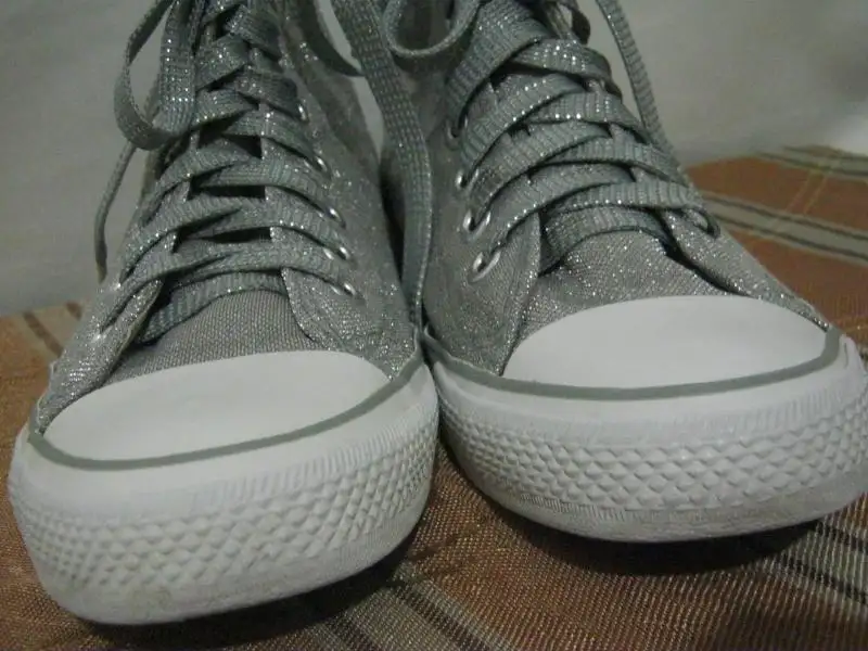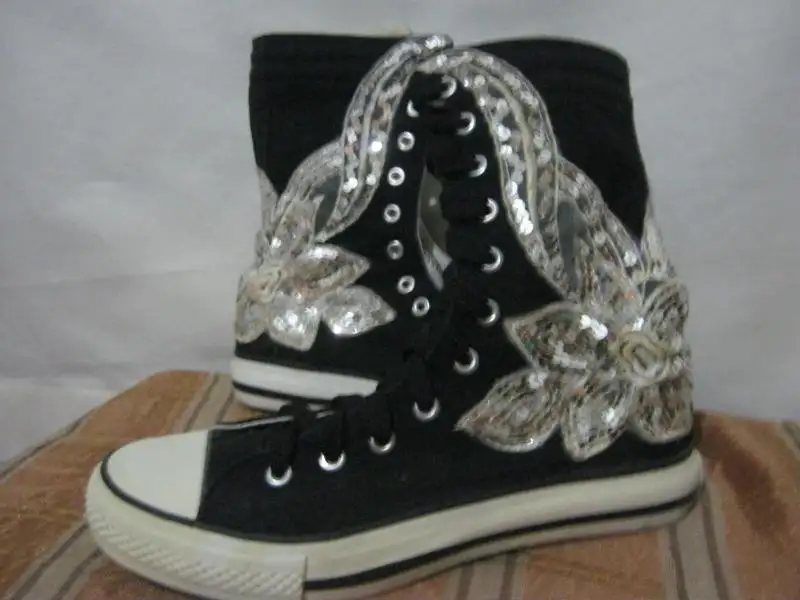 İki adet 39 numara convers: biri uzun-siyah-kenarlarında gümüş pul işlemeli çiçek deseni var, diğeri kumaşı parıltılı gri renk.