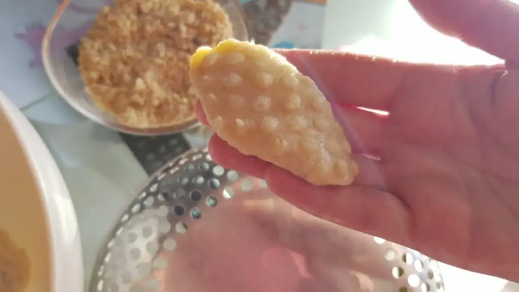 • Ortasına dövülmüş ceviz içinden bir miktar yerleştirilir ve hamurun kenarları ortada birleştirilerek iyice kapatılır.