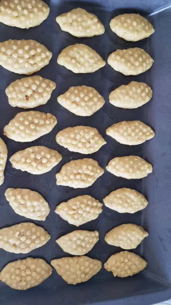 • Hazırlanan tatlı ters çevrilerek kalburdan alınır ve fırın tepsisine aralıklı olarak dizilir.