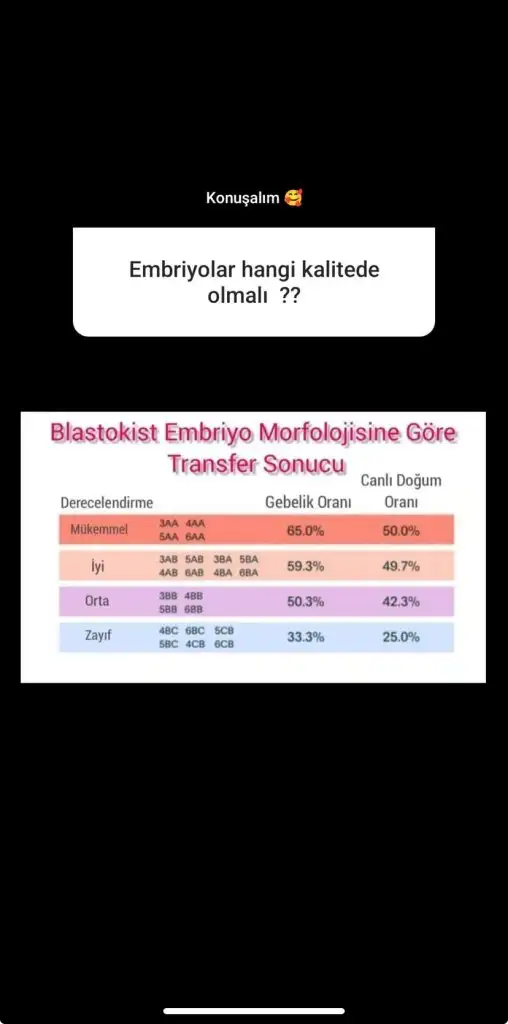 4aa düşük 4ab kimyasal gebelik 4bb kimyasal gebelik son transfer 3ab ve 4bb ikiz canlı doğumBelki Sizede fikir olur diye paylaşmak istedim sizlerin hangi kalitede hadi paylaşalım