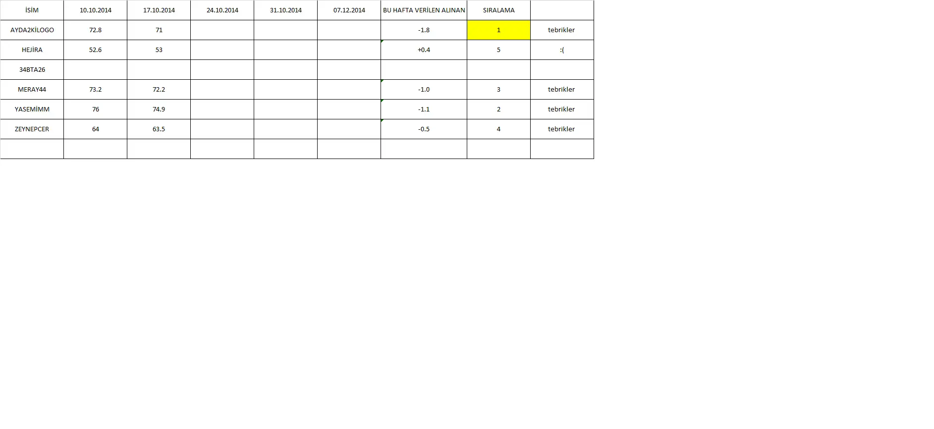 verdik verdik güzel kilolar verdik birinci ben olmuşumMerhabalar bugün yağmurlu bir hava iç sıkıcı egzersizlere başlasam içim çok rahatlayacak sizler nasılsınız oğlumu kreşe gönderme telâşındayım bugün güzel kilolar verilmiştir listeyi akşama görürüz