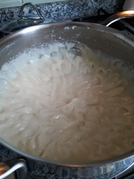 Krema için önce krem şanti ve vanilya hariç tüm malzemeler bir tencereye konur. Biraz çırpıldıktan sonra ocağın altı açılır ve un kokusu gidene kadar karıştırarak pişirilir.