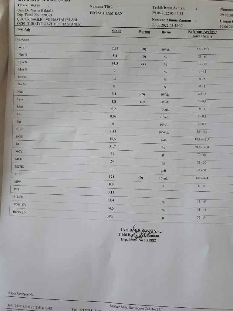 Çocuk Hastalıkları Kan değerleri düşük lütfen yardım