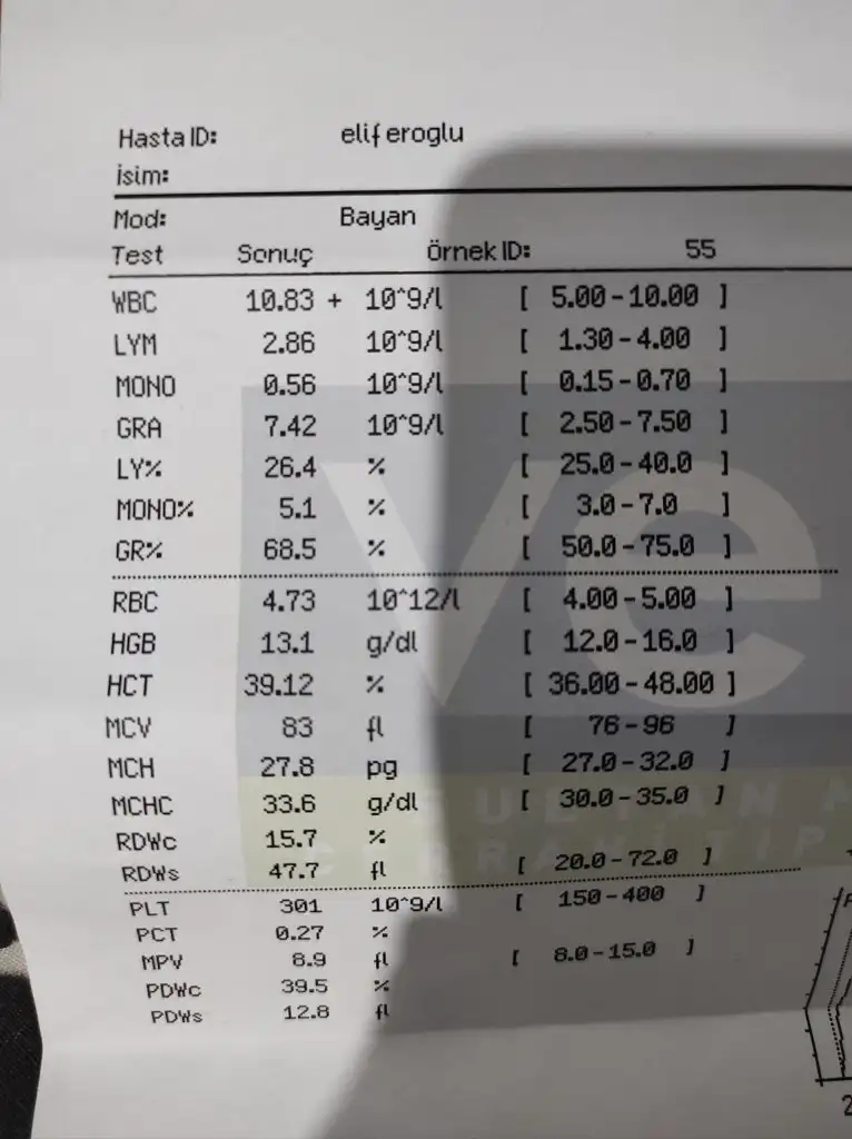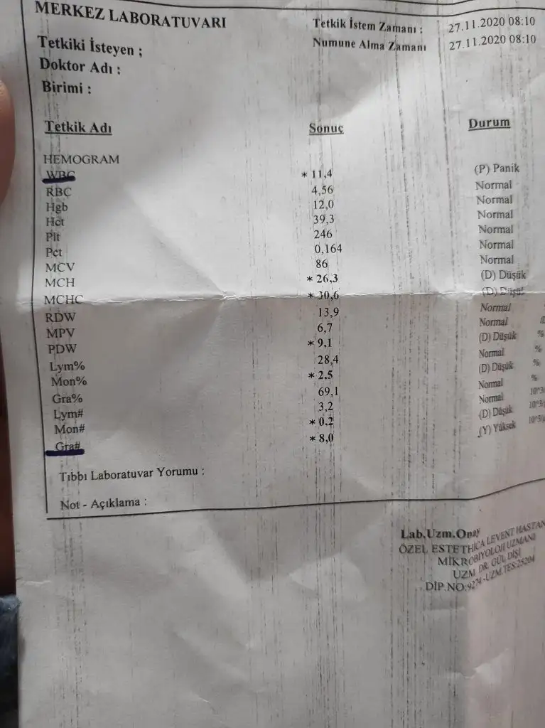 Selam kizlar ameliyat olucaktim karin germe hemogram testim böyle bir değer çıkmıştı biraz daha iyidi doktorum enfeksiyon varlığı görünüyor ceftinex vereyim 1 hafta kullan yeterli olur dedi ben 10 gün kullandım 12.gunu sabahı böyle çıkınca sizi ameliyat edemem azalması gereken değer artmış dahiliye gitmenizi tavsiye ediyorum dedi.
