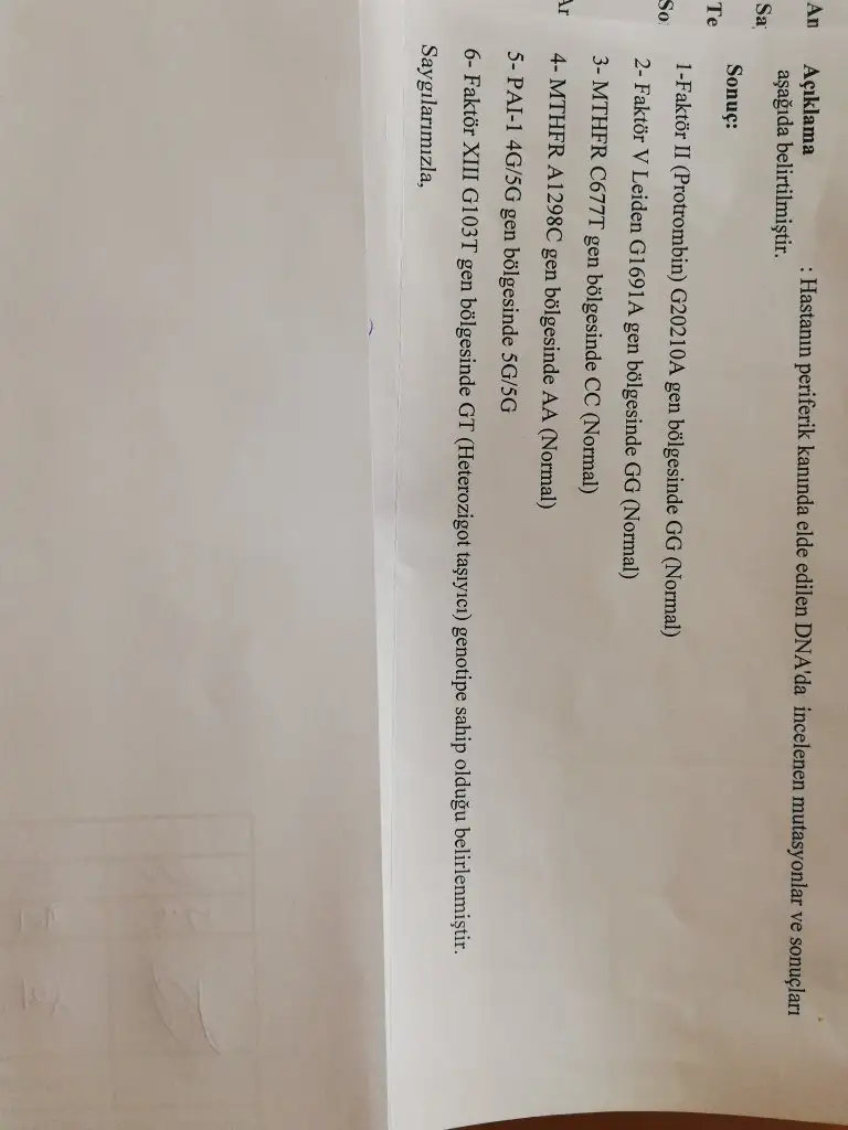 6.maddeye bakabilirmsnz varmı sıkıntımızTrombofili paneli deniliyor. Bu arkadaşın 2 geni hetero biri homozigot. Benimkinden bile ileri yani. Sürekli drlarla muhattap olunca artık az çok biliyorum