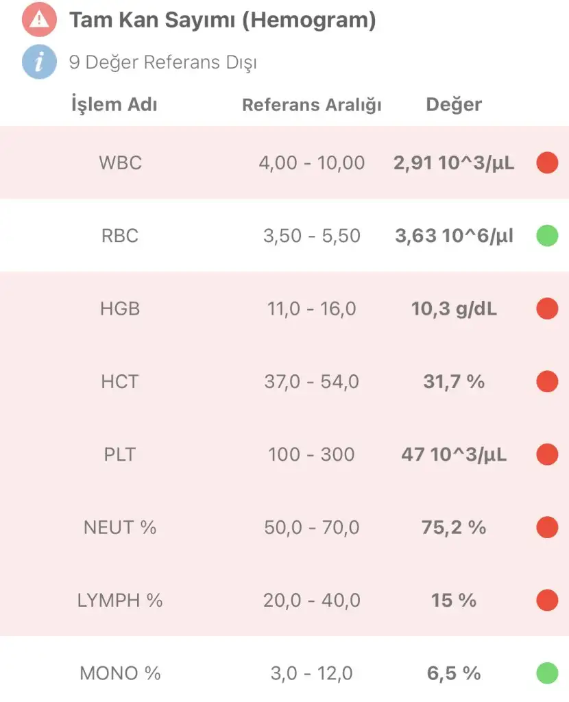 Bu kan değerleri kimin? Trombositlerinde ciddi düşüş var, kanama tehlikesi olabilir, üzülerek söylüyorum ama bu değerlerin ciddi bir şekilde araştırılması gerekir.
