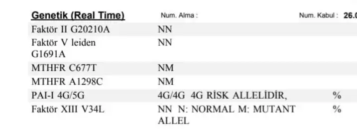 Kizlar merhaba embriyo transferi oncesi doktorum gerek yok dedigi halde icime sinmedi kanda pihtilasma icin test yaptirdim lutfen bilenler varsa sonuclara bakabilirmi tibbi genetik doktoru bir kac gende sorun var ama tup bebek icin etki edicek bir sorunun yok yinede doktora gosterirsin dedi
