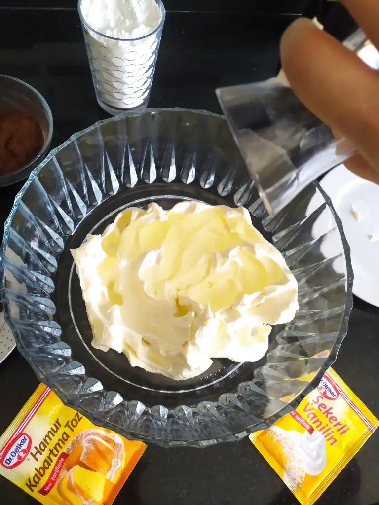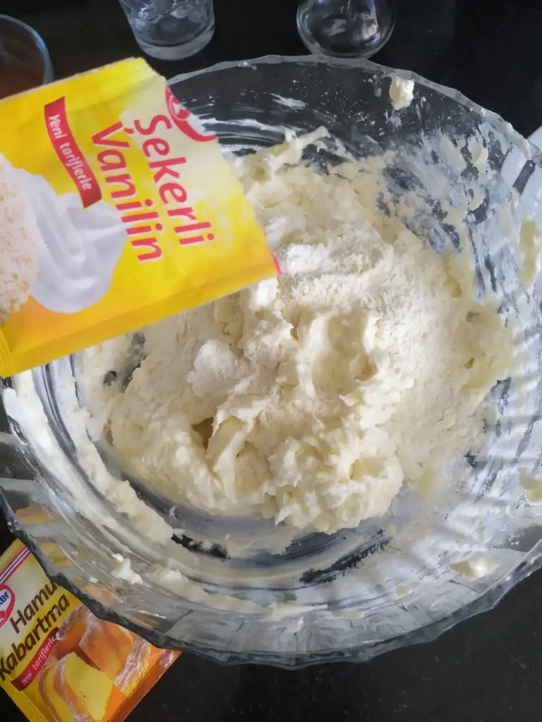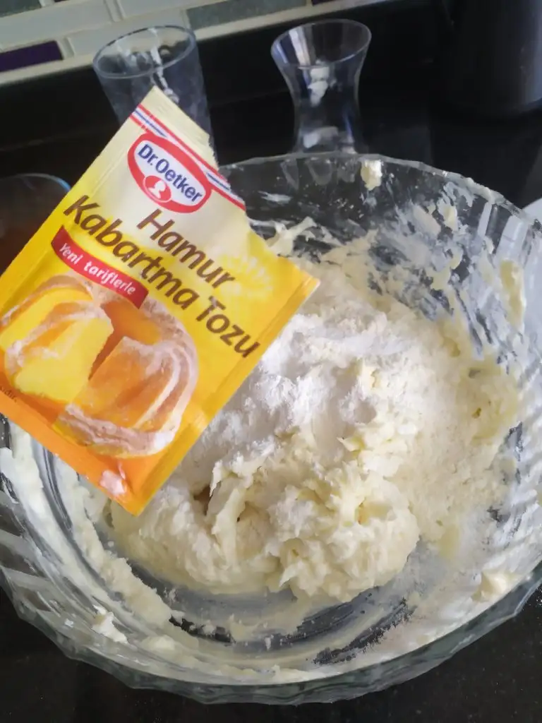 Yarım kabartma tozu ve vanilyayi ilave ediyoruz