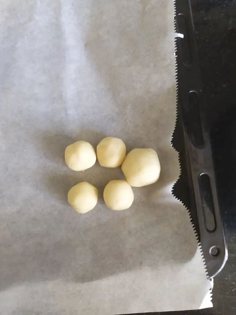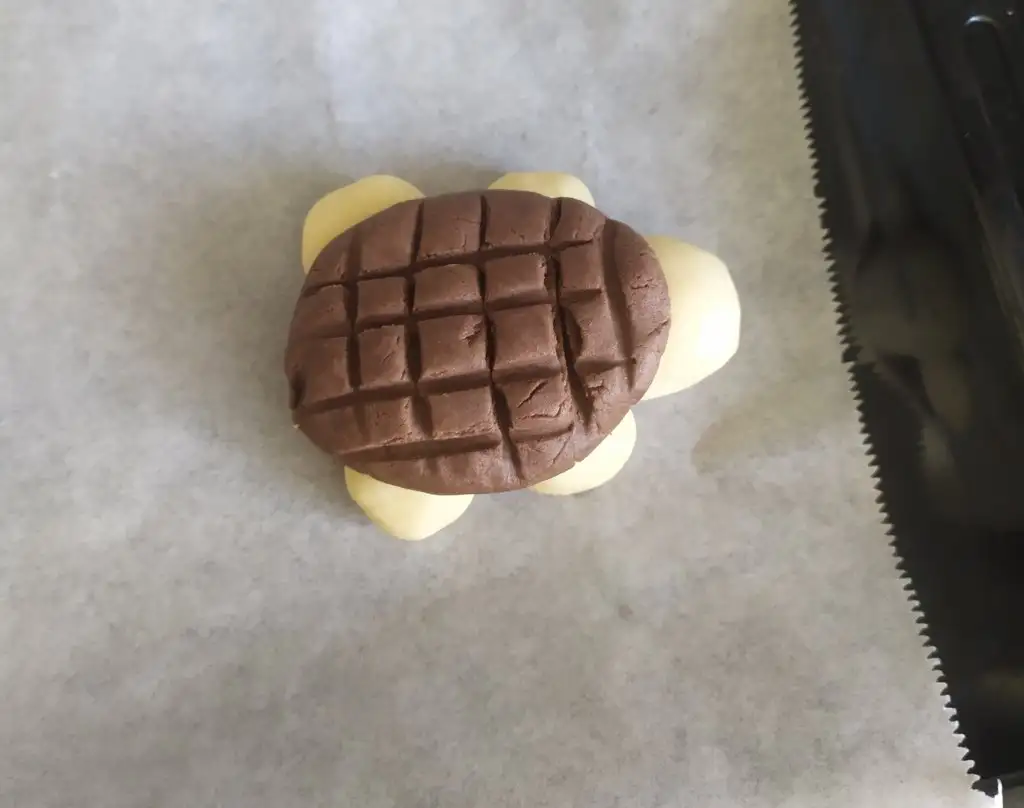 Sonra diğer sade hamurumuzu alıp küçük toplar yuvarliyoruz. 4 küçük ayak, 1 orta buyuklukte kafa yapıp tepsiye koyuyoruz