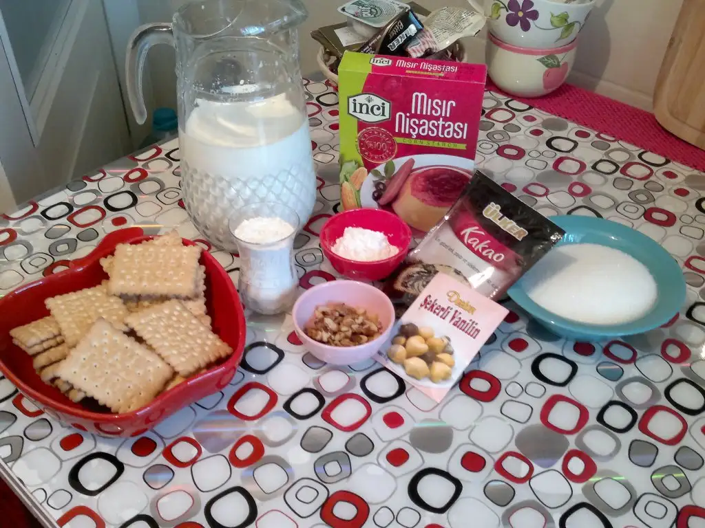 Sutu.sekeri.unu.misir nisastasini.kakaoyu..vanilyayi/karistir.muhallebi kivamina gelene kadar iyice pisir.ve ilit. icine bir paket petibor buskiviyi kir ekle..cevizide ekle..kaliba dok ve yay..