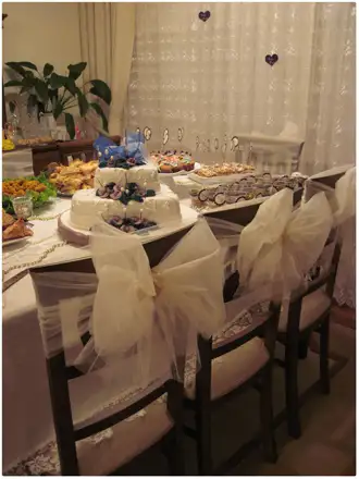 Yemek masasının sandalyelerini tül ile süslicem. Masada ikramlıklar arasında naza boncukları serpiştirilecek. Pastayı aşkımla seçip yaptırıcaz tahminen masam da şuna benzicek Eki Görüntüle 253549