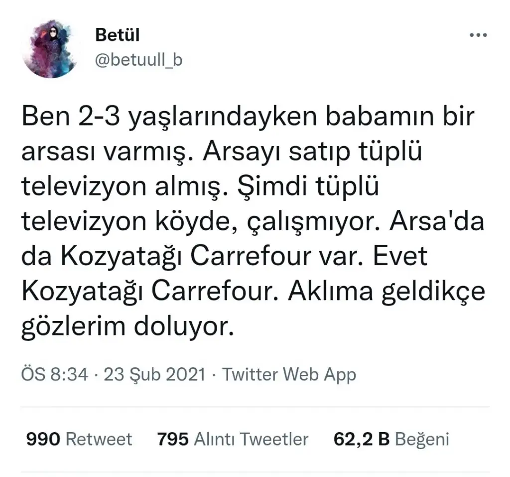 şey düşündüm adam öyle yada böyle gelecek zaten yaşadığımız yerde başka farklı işleri de varmış . siz fiyat ne veriyorsunuz diye sorarım o miktarı söyledikten sonra da hımm kalsın o zaman şimdilik derim :) çok mu saçma oldu yaaHiç şaşırmadım, sülalesi de kendi gibi bugün buldum bugün yiyeyim insanıymis bellieşine uyarsan sizin kıza da birakacaginiz bir şey kalmaz. Sen eşine değil kendi ailene uy, bak onlar ne güzel sana zor gününde destek olacak mülk birakmislar,güvence bırakmışlar. Belki onlar da zamanında zorlanip almışlar o arsayı, ya da miras kaldiysa satmak yerine seni düşünüp kenarda bekletmisler...Kendin için değilse de çocuğunu düşün,onun geleceği için en dogru olanı yap.
