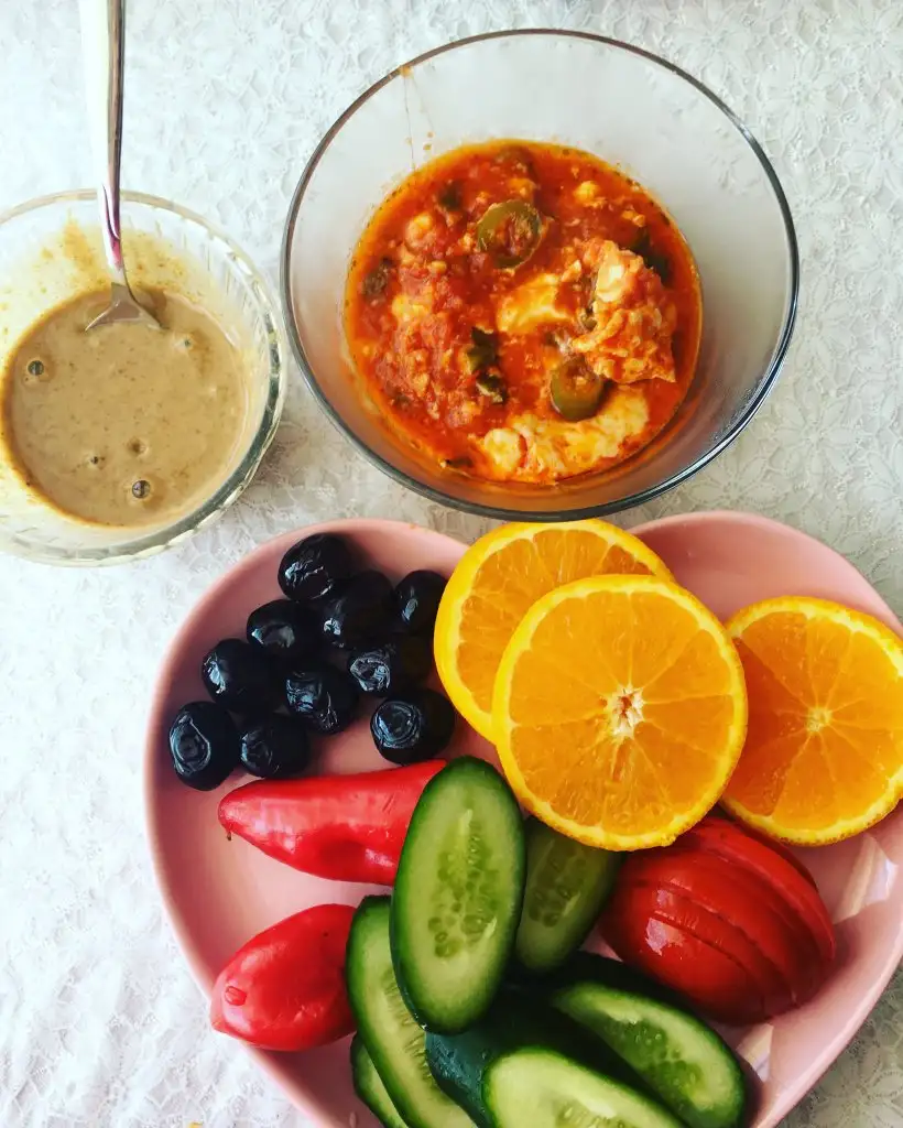 sabah yumurta domates salatalık biber zeytin tuzauz peynir şekersiz çay ceviz Bir küçük portakaL