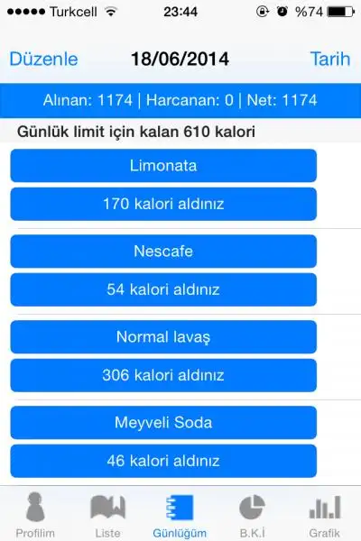 Burada yemeklerin besinlerin kalori değerleri var. Gün tarihini otomatik değiştiriyor. Sen sabahtan itibaren ne yediysen ekliyorsun. Eki Görüntüle 1161636