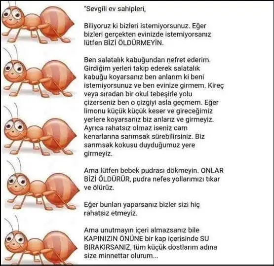 Ayyyy çok tatlısın.Nefret ettim ben artk onlarla yaşamayı ogrendım.bır kac gundur yagmur var dıye cıkmıyolardı.ama suan tam gaz devam.tarcın döktüm karınca tozu döktüm ilaç sıktım olmadı.