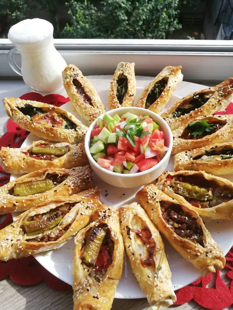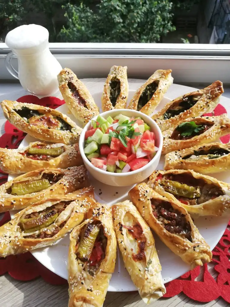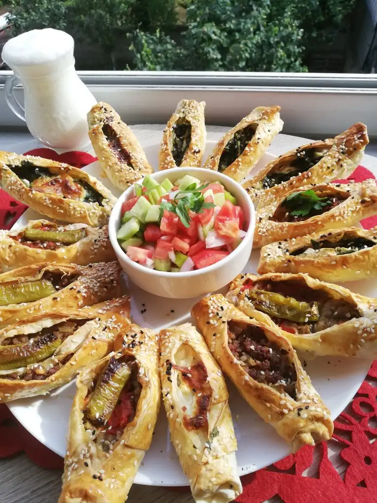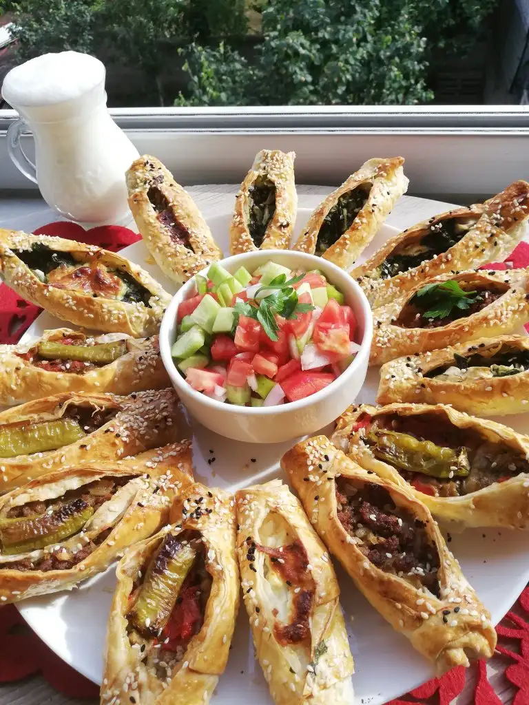-İç malzeme izi biraz bol koyup kenarlardan katlayıp sigara böreği sarar gibi sarıp tepsiye dizelim.