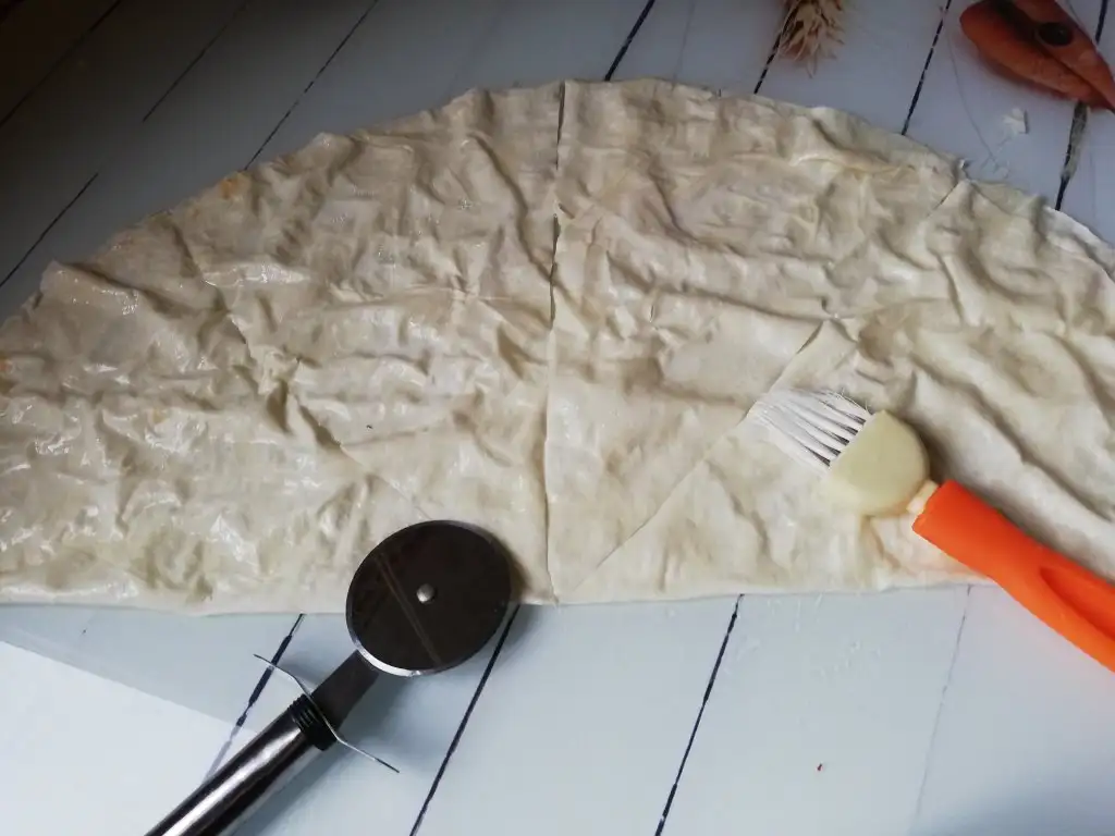 -Üstüne yumurta sarısı sürüp bıçakla kenarlardan 2 parmak içeride olacak şekilde keselim. Dikkat edelim bıçak aşağıya kadar kesmesin, iç malzemeye kadar ilerleyelim.