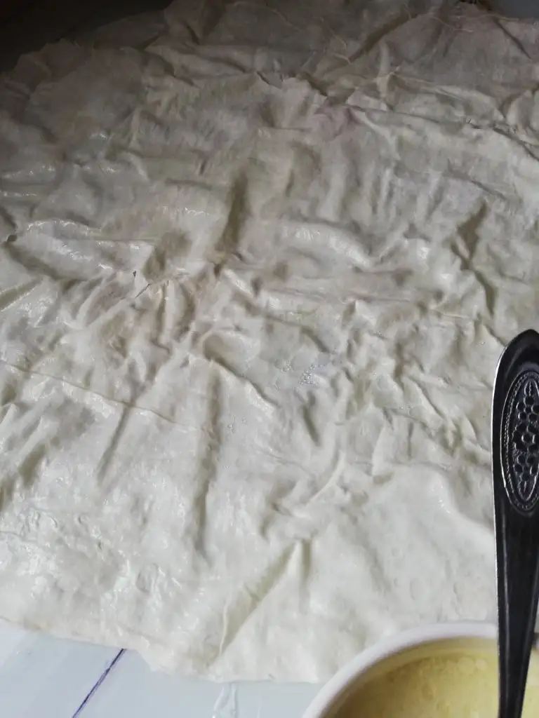 -1 yufkayı serip yarısına süt, yağ karışımını sürüp ikiye katlayalım.