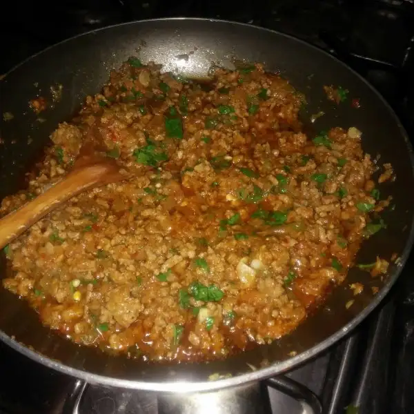 biraz kavurduktan sonra,kiymamizi koyuyoruz ve az daha kavuruyoruz.ardindan domatesimizi ve sarimsaklarimizi ilave ediyoruz.biraz daha kavrulduktan sonra 1 tatli kasigi salca,bir tatli kasigi karabiber pulbiber ve kimyon,ardindan da tuzumuzu ilave ediyoruz.son olarakta maydonozlari ilave edip ocagin altını kapatiyoruz.