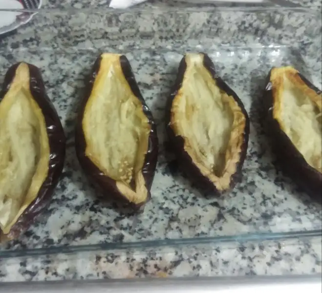 kozlenen patlicanlarimizi firindan çıkarıp icini bir kasik veya catal yardimiyla duzlestiriyoruz ve hazirladigimiz harctan icine bol bol koyuyoruz.bir yemek kaşığı salcaya biraz sicak su ekleyip tepsiye dokuyoruz ve tekrar firina veriyoruz.yaklasik bi 20 dk yetiyor